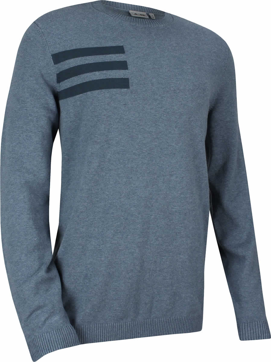Adidas 3-Stripes Crewneck Golf Sweaters are constructed with 86% Cotton, 12% Nylon, and 2% Spandex, ribbed cuffs and hem, 3-stripes on the chest, and a crewneck construction for easy on and off as conditions change out on the golf course.
