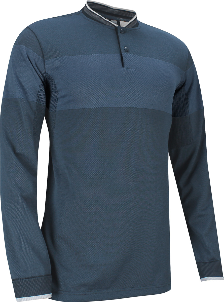 Adidas Primeknit Long Sleeve Golf Shirts are constructed with a colorblock design, a 2-button placket, and the Adidas brandmark on the left sleeve.