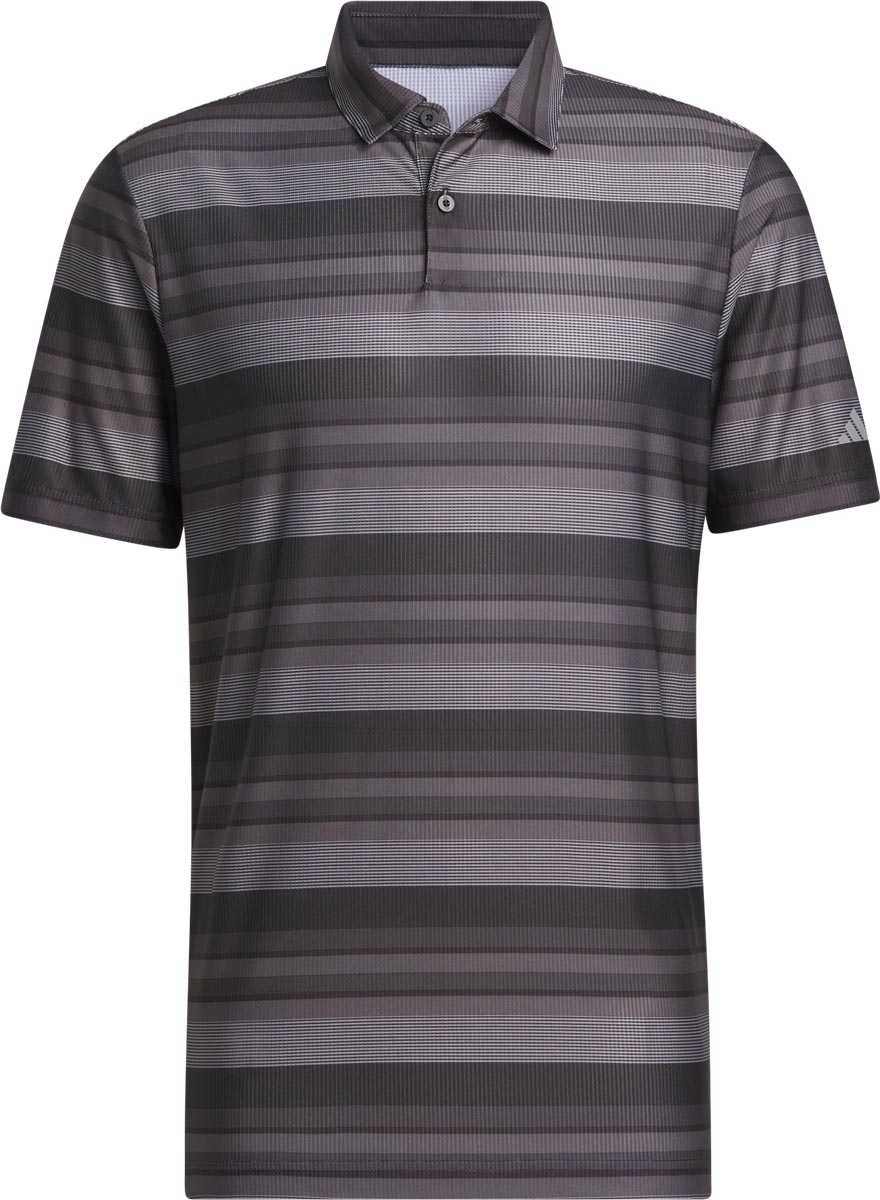 Adidas Ultimate 365 Tour HEAT.RDY Stripe Golf Shirts are constructed with 93% Recycled Polyester, 7% Spandex, two-button placket, self collar, and a multi-color stripe design.
