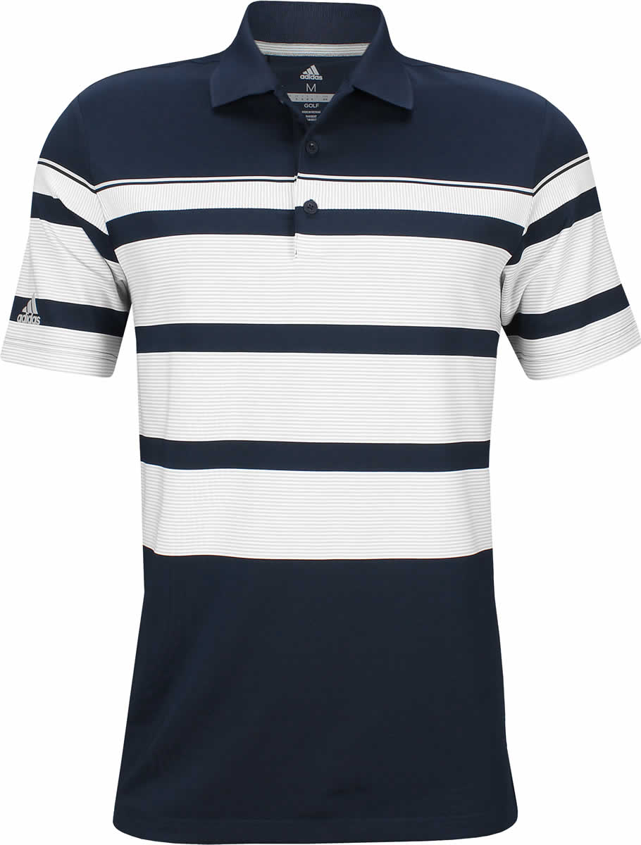 Adidas Ultimate Engineered Stripe golf shirts are constructed with 92% Polyester and 8% Spandex, a 3-button placket, a wide stripe design, and the Adidas brandmark logo on the right sleeve for unbeatable golf style.