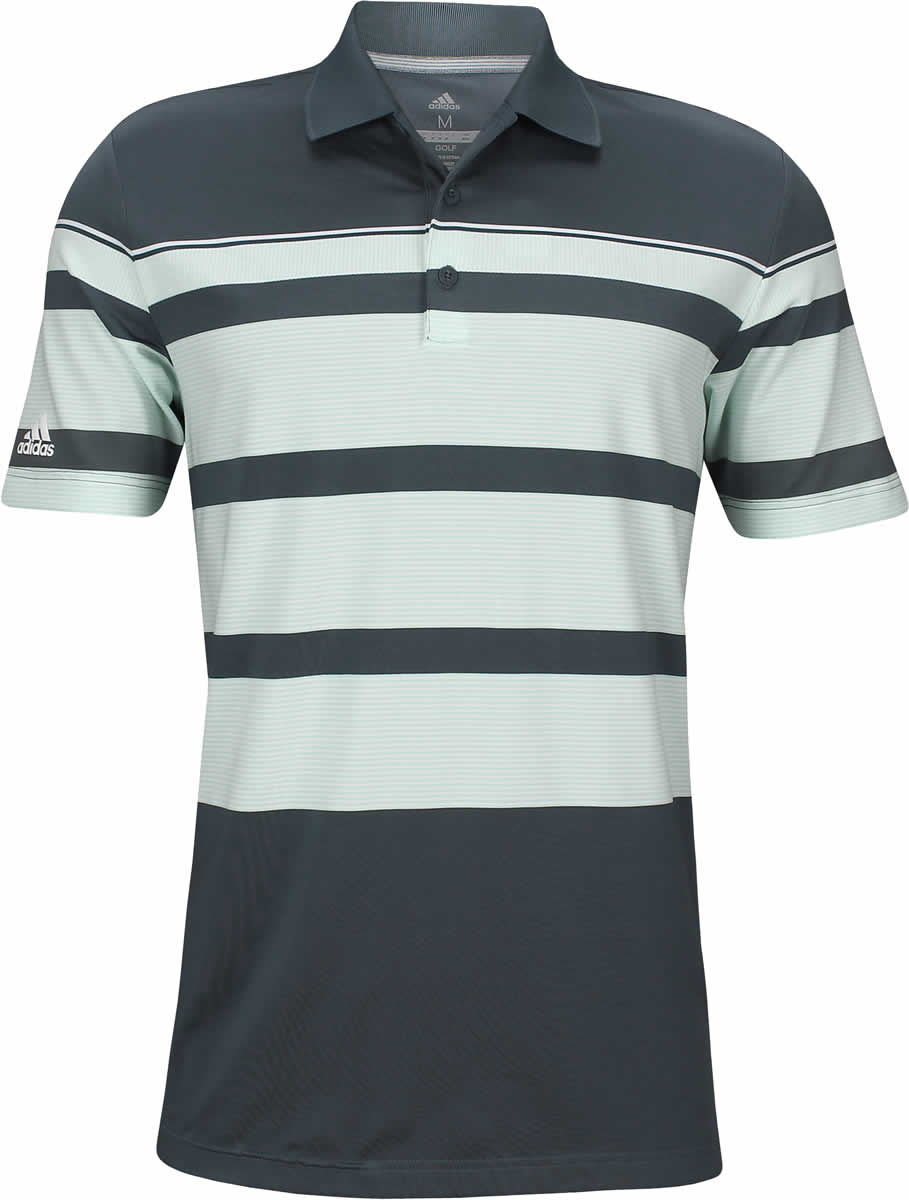 Adidas Ultimate Engineered Stripe golf shirts are constructed with 92% Polyester and 8% Spandex, a 3-button placket, a wide stripe design, and the Adidas brandmark logo on the right sleeve for unbeatable golf style.