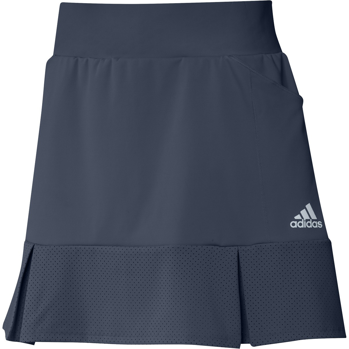 Adidas Women's 15" Pleated Perforated Golf Skorts are constructed with 85% Recycled Polyester and 15% Elastane, two front pockets, and a back right pocket.