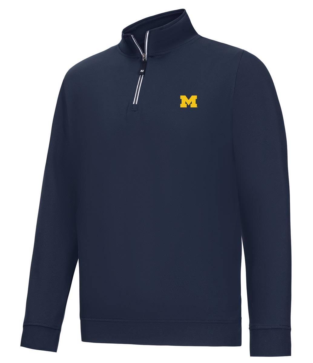 FootJoy Approach Quarter-Zip Golf Pullovers are constructed with 91% polyester, 9% Spandex, a pullover design with a quarter-zip opening and embroidered with the University of Michigan logo.