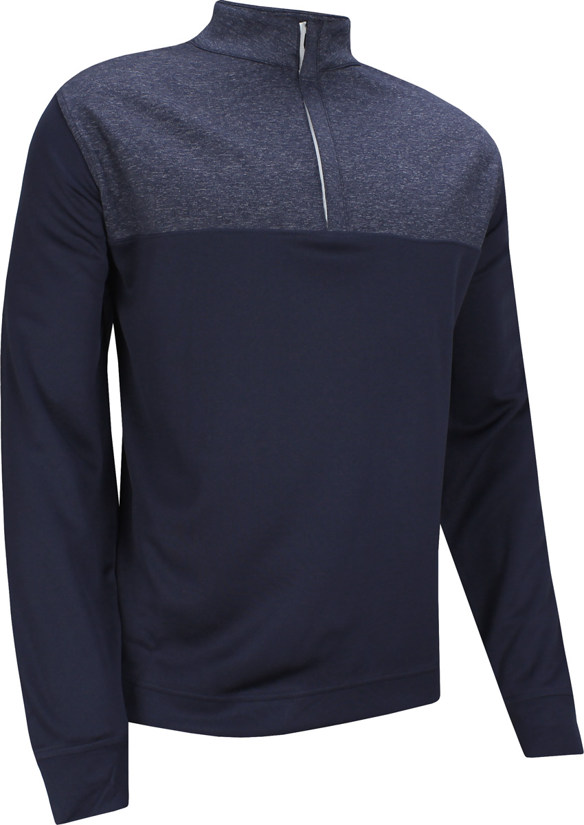 FootJoy Heather Yoke Half-Zip Golf Pullovers are constructed with a half-zip opening, banded cuffs and hem, and a heather upper yoke.