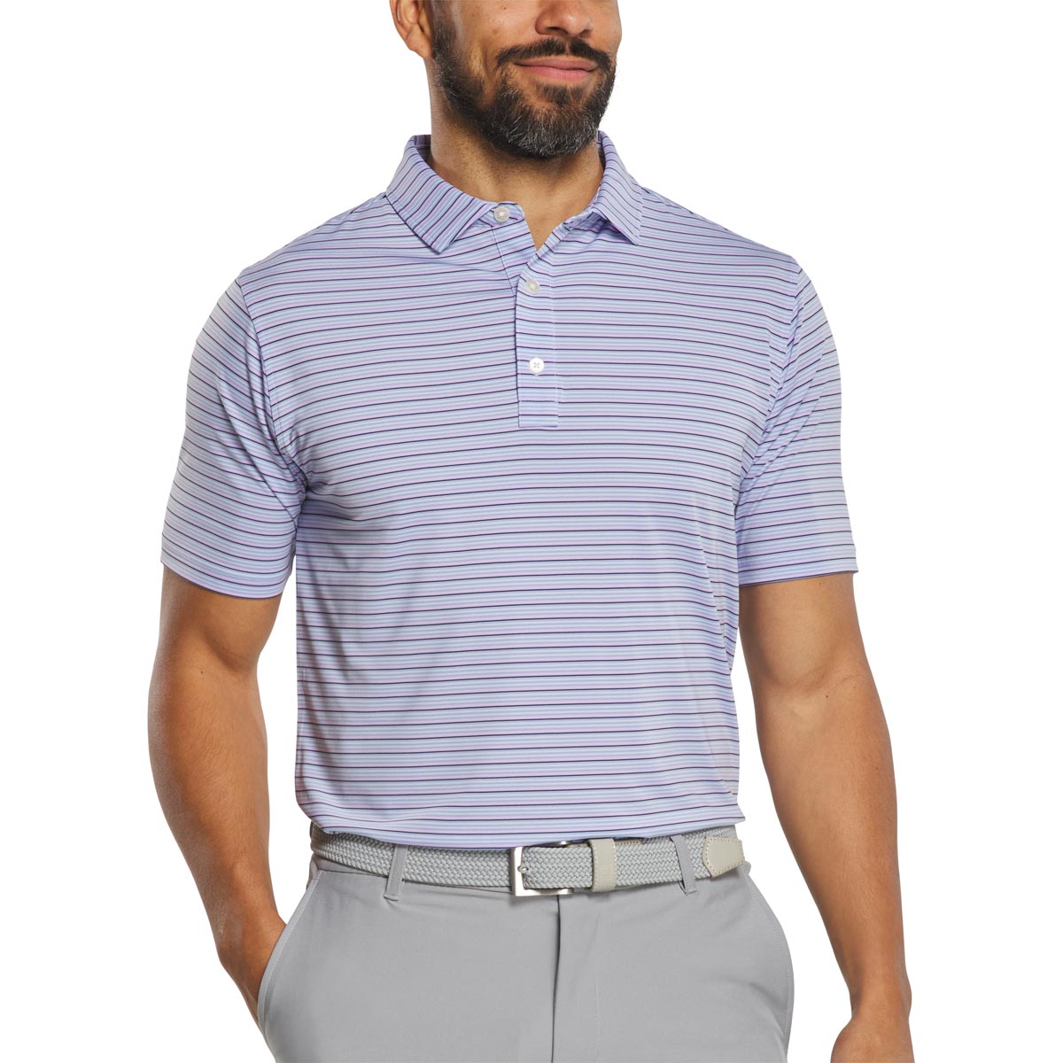 These FootJoy golf shirts are designed with a 3-button placket, a multistripe print, and a self collar.
