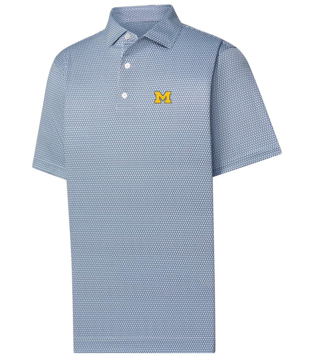 FootJoy Speckle Lisle Print Golf Shirts are constructed with 88% Polyester, 12% Elastane, a 3-button placket, a subtle speckle print and embroidered with the University of Michigan logo.