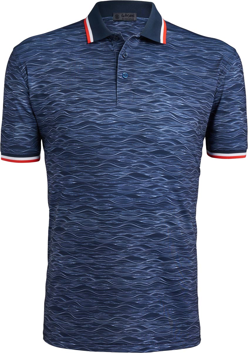 G/Fore Wave Jersey Golf Shirts are constructed with 92% Polyester, 8% Spandex, 3-button placket, knit collar, and novelty wave print.