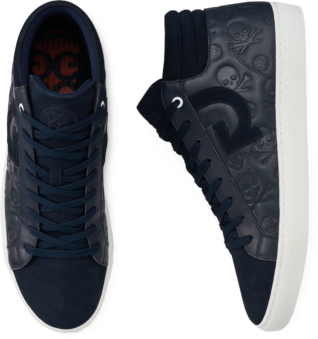 G/Fore Quarter G Chukka Casual Shoes - ON SALE - Twilight navy with debossed G/Fore logos, white sole, and orange with G/Fore logos on outsole