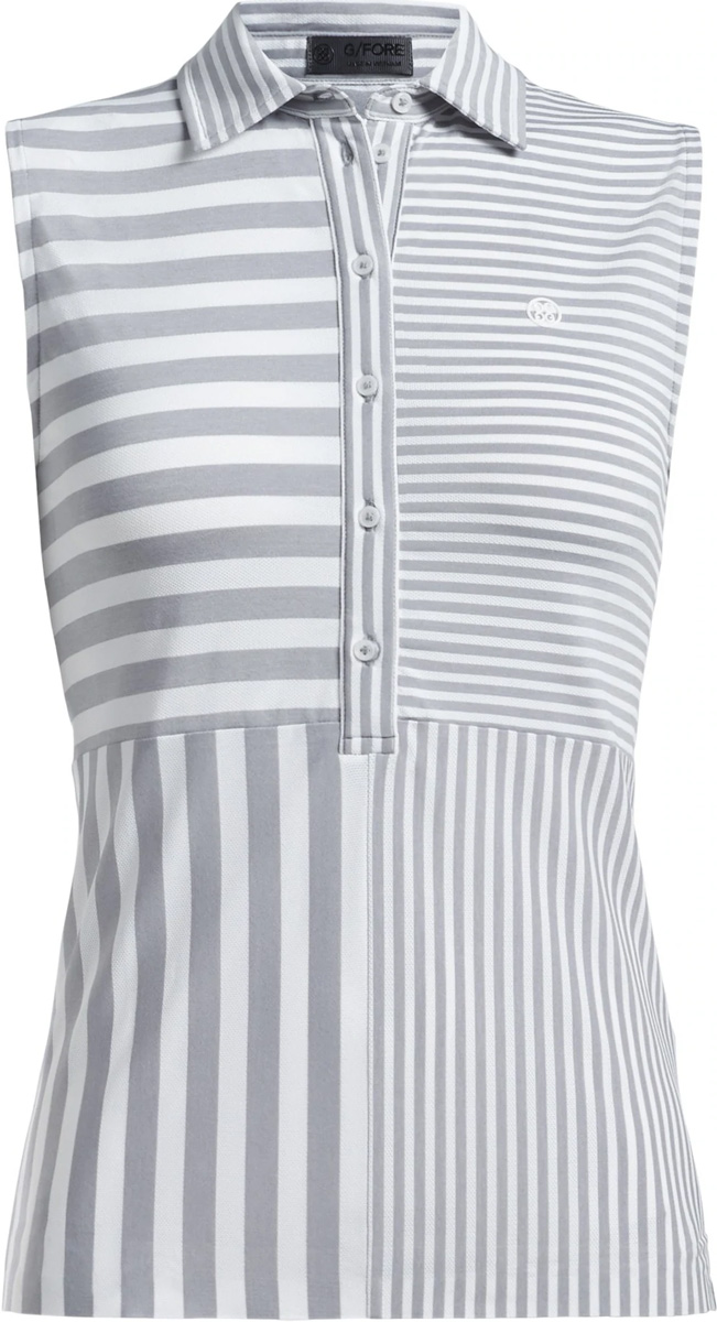 G/Fore Women's Performance Stripe Sleeveless Golf Shirts are made with 62% Nylon, 30% Polyester, 8% Spandex, six-button placket, self collar, and multi-stripe design.