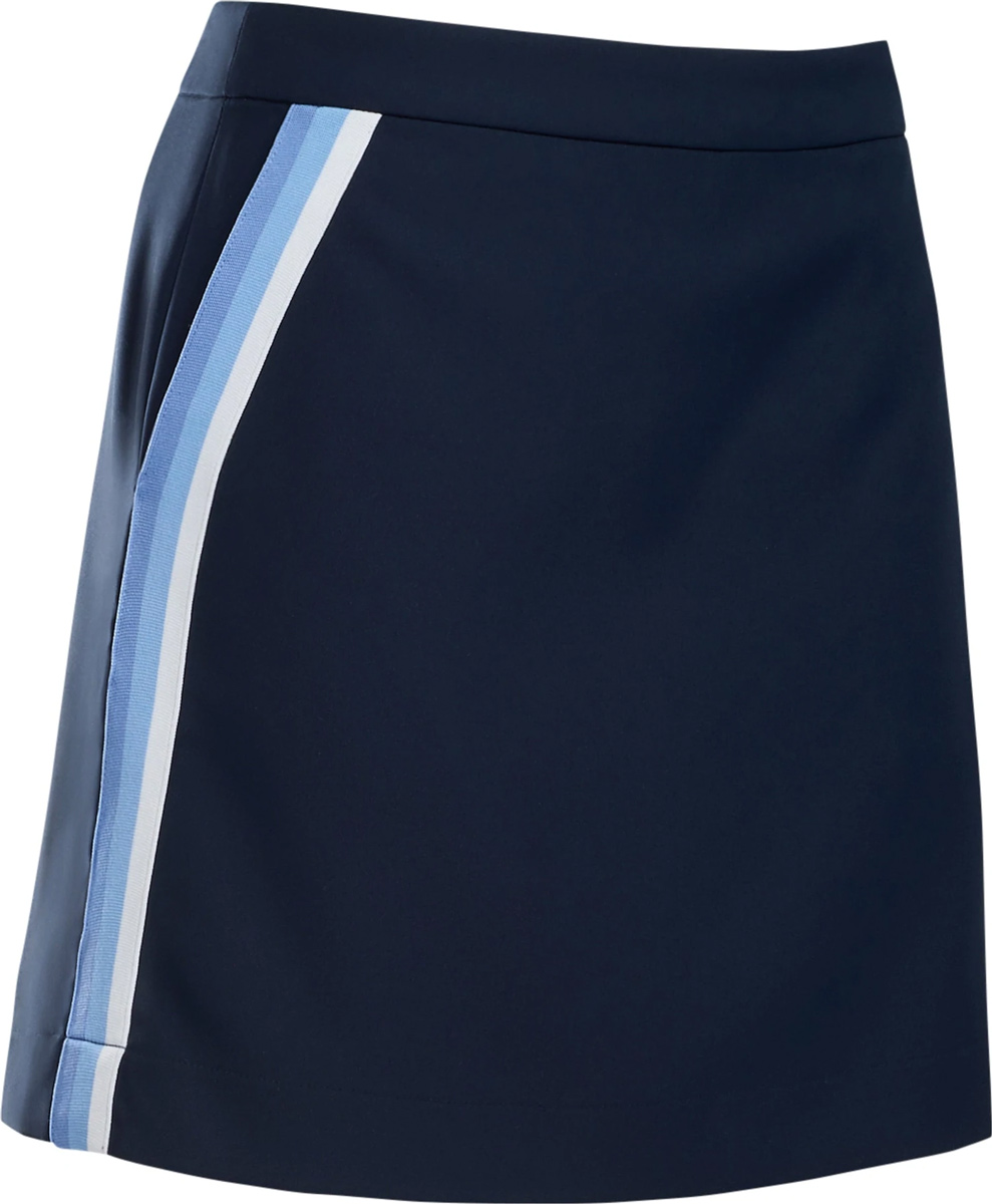 G/Fore Women's Tux Golf Skorts are constructed with 100% Polyester, front pockets framed with colorful knit trim, hidden zipper closure along the side, built-in shorts, and 16" outseam.