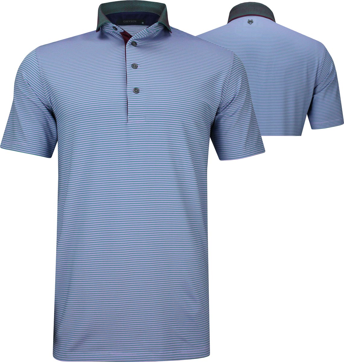 Greyson Clothiers Arcadia Golf Shirts are constructed with 90% Recycled Polyester, 10% Spandex, four-button placket, knit collar, and a stripe design.