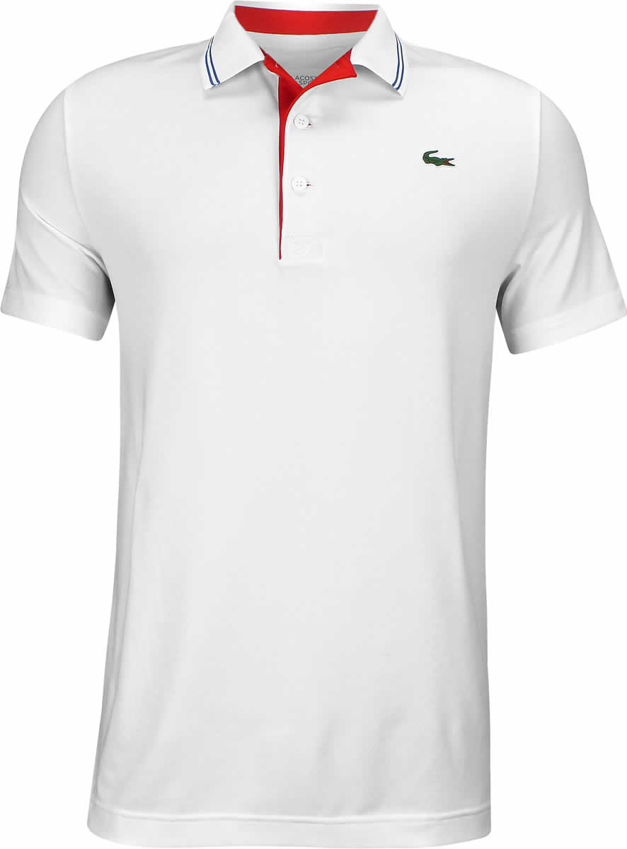Specs for Lacoste Solid Jersey Contrast Piping Golf Shirts - White/Pomegranate - HOLIDAY SPECIAL