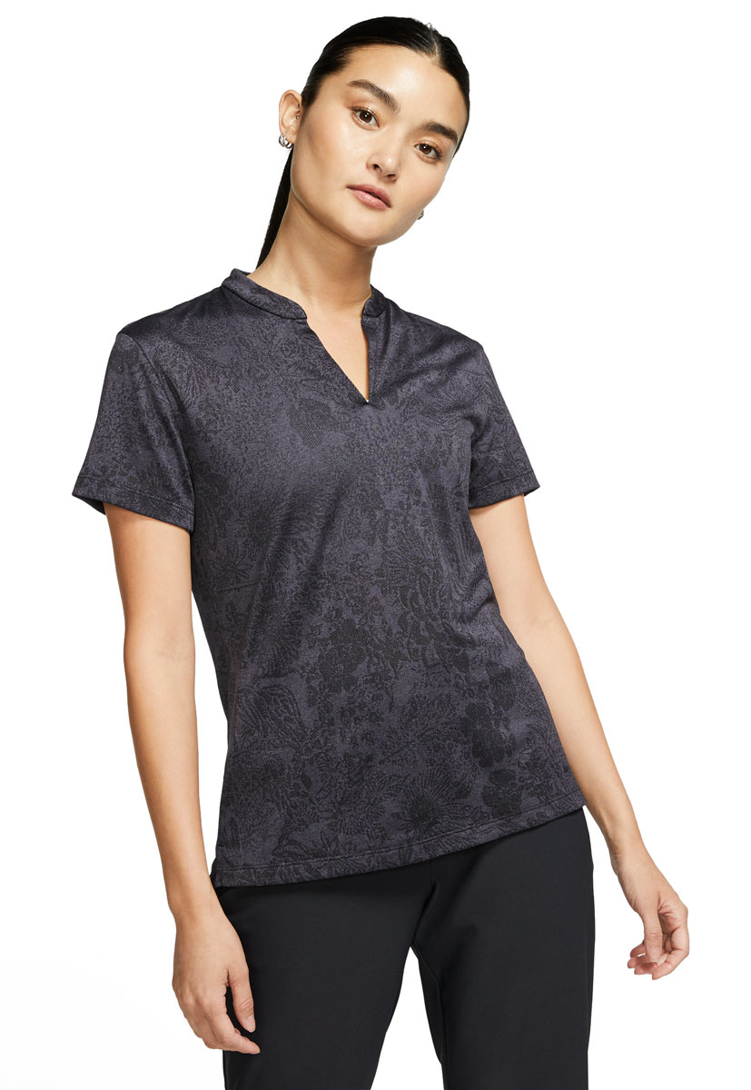 Nike Women's Breathe Ace Jacquard Golf Shirts offer highly breathable fabric with a modern neckline and a tonal floral print.