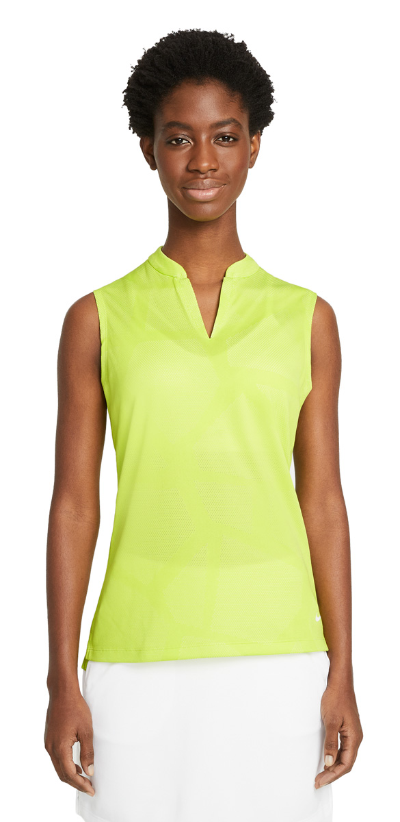 Nike Women's Breathe Jacquard Sleeveless Golf Shirts feature a v-neck design that puts a modern twist on the classic polo neckline.