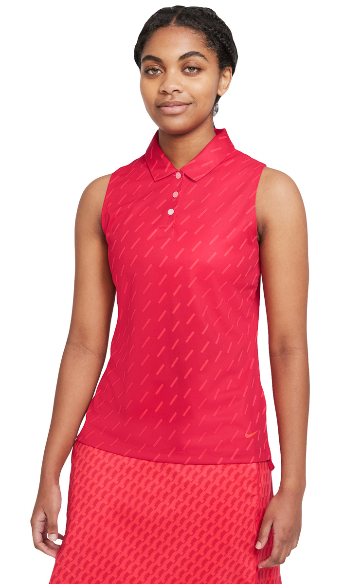 Nike Women's Dri-FIT Victory Dash Print Sleeveless Golf Shirts are constructed with 100% Polyester, a 3-button placket, and a modified racerback.