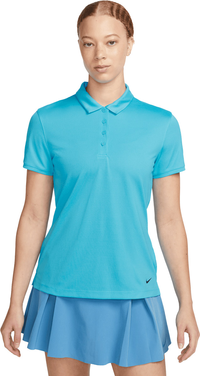 Nike Women's Dri-FIT Victory Solid Golf Shirts are constructed with 100% Recycled Polyester, a 4-button placket, and the Nike Swoosh brandmark on the bottom left hem.