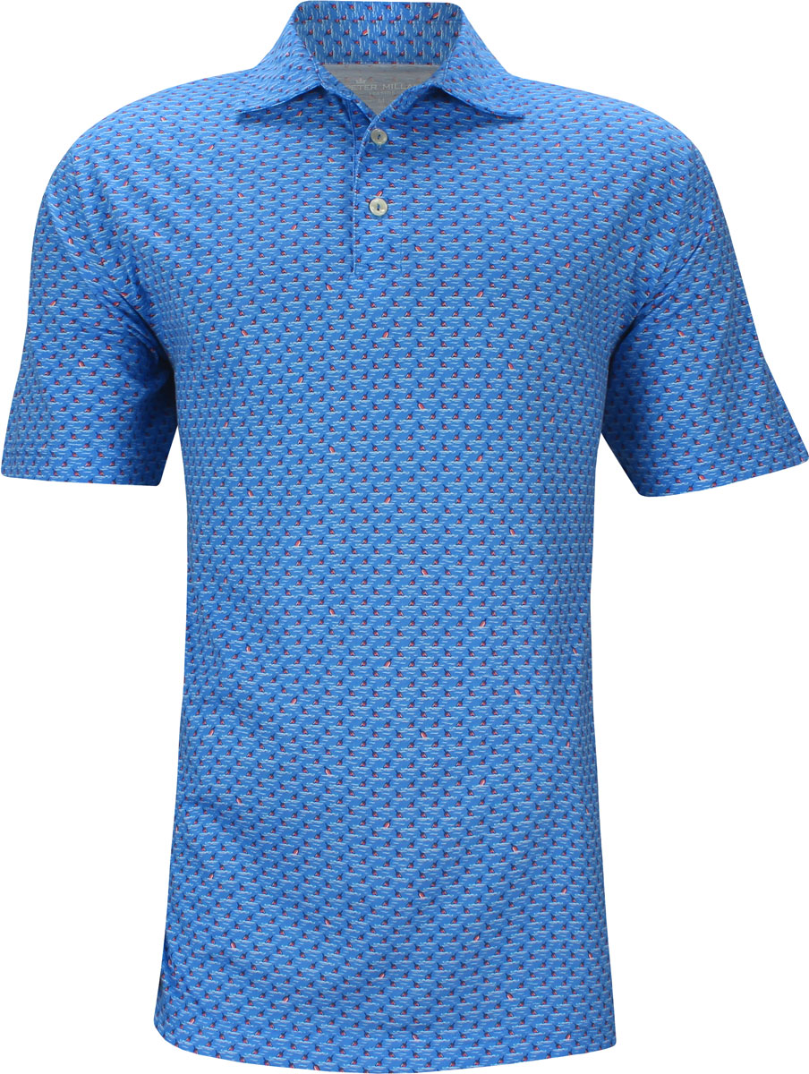 Peter Millar Buoys And Bourbon Aqua Cotton Golf Shirts - Plumbago blue with buoy and bourbon print