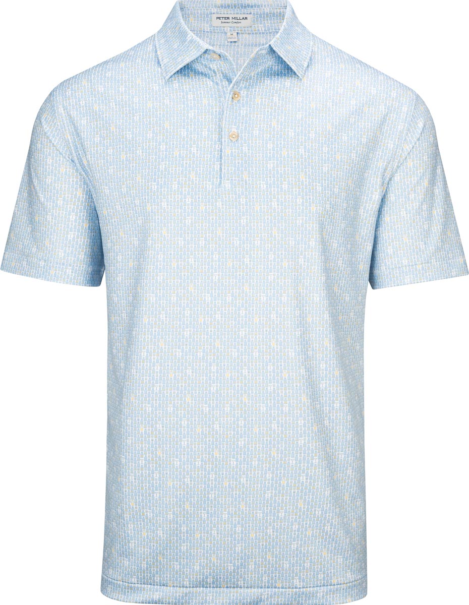 Peter Millar Raise The Bar Performance Jersey Golf Shirts are constructed with 92% Polyester, 8% Spandex, three-button placket, self collar, and a subtle bar tool print.