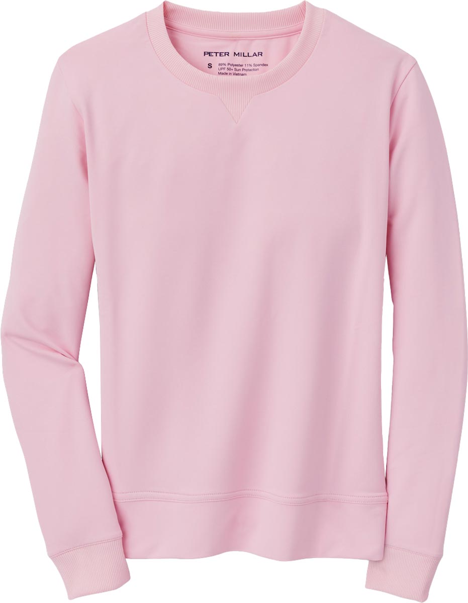 Peter Millar Women's Birdie Sport Golf Pullovers are constructed with 89% Polyester, 11% Spandex, banded cuffs, and crewneck construction with a ribbed collar.