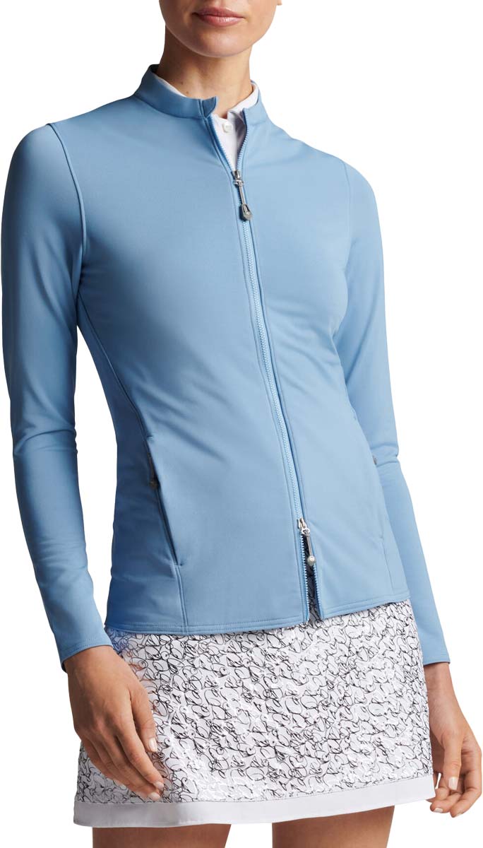 Peter Millar Women's Katy Full-Zip Golf Jackets are constructed with 89% Polyester, 11% Spandex, zippered front pockets, tapered collar, and two-way zip front.