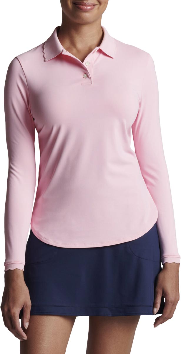 Peter Millar Women's Opal Stretch Jersey Long Sleeve Golf Shirts are constructed with 92% Polyester, 8% Spandex, three-button placket, self collar, curved hem, and scalloped collar and cuffs.