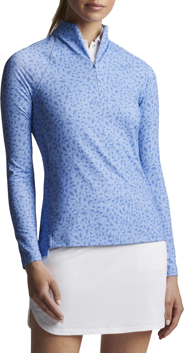 Peter Millar Women's Perth Raglan-Sleeve Quarter-Zip Golf Pullovers are constructed with 89% Polyester, 11% Spandex, quarter-zip opening, a subtle floral print, and mock collar.