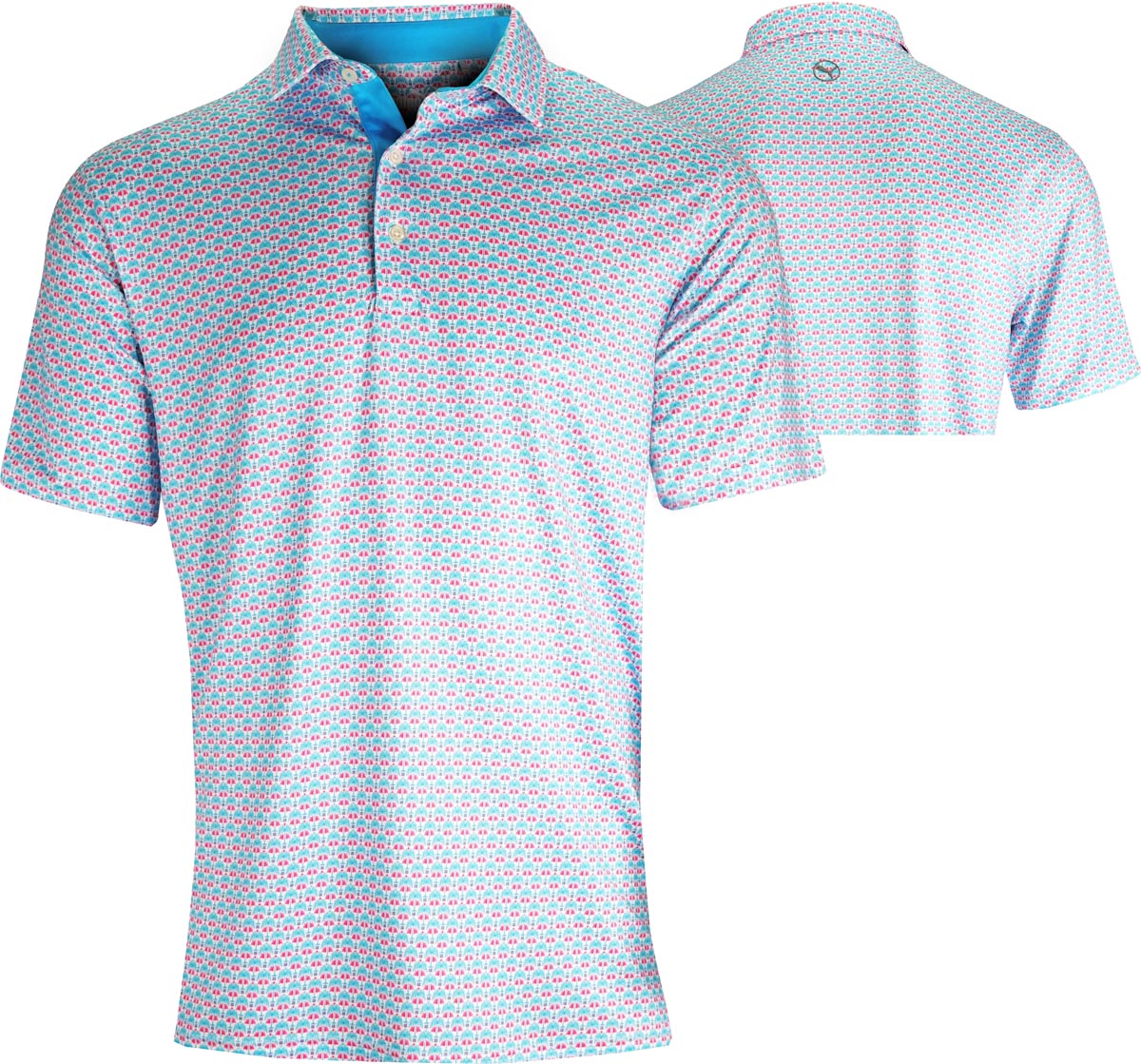 Puma MATTR Palm Deco Golf Shirts - ON SALE - Aqua blue with garnet rose palm deco print