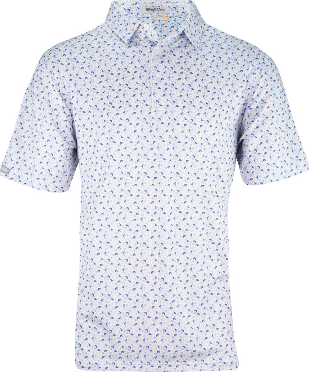 Straight Down Sparrow Golf Shirts are constructed with 92% Polyester, 8% Spandex, three-button placket, self collar, and a sparrow print.