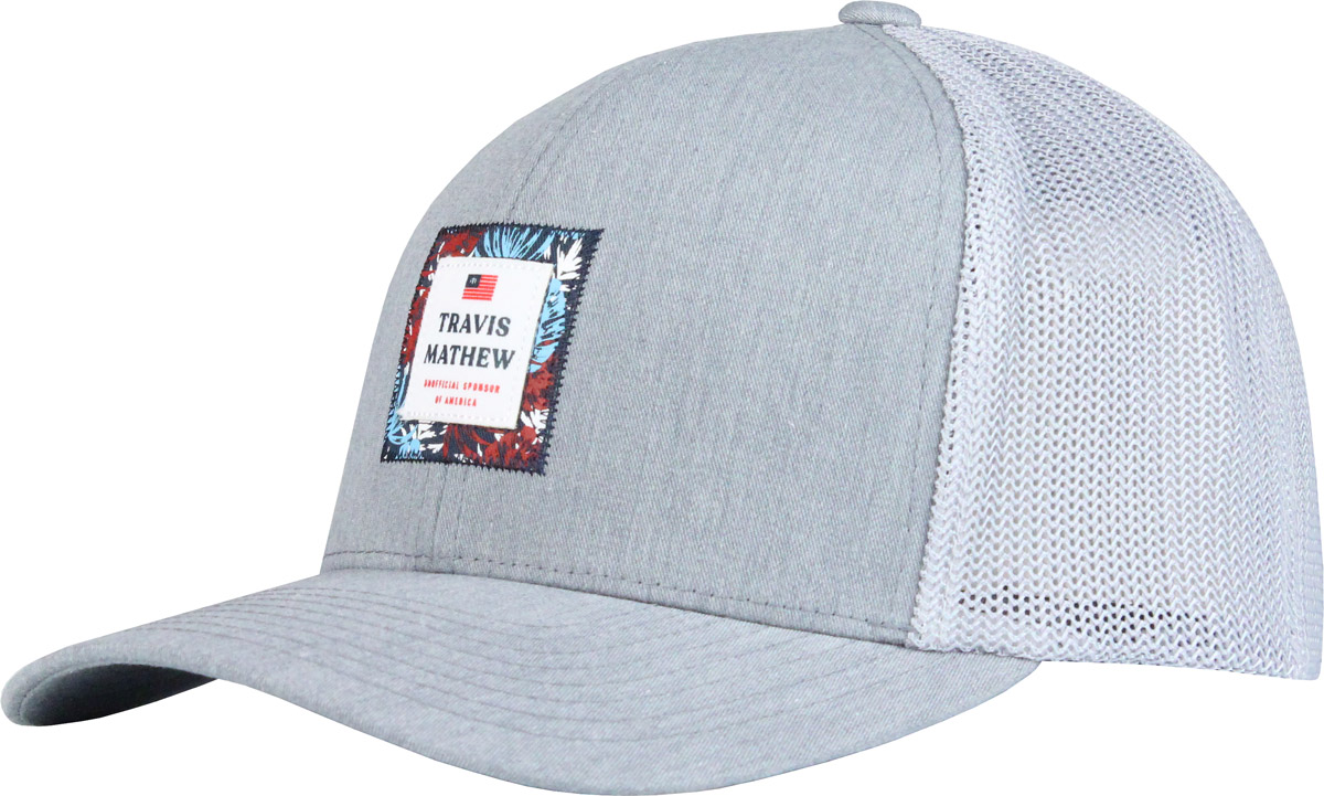 TravisMathew Certain Amenities Snapback Adjustable Golf Hats are constructed with 63% Polyester, 34% Cotton, 3% Polyurethane, floral logo patch, mesh backing, and adjustable snapback closure.