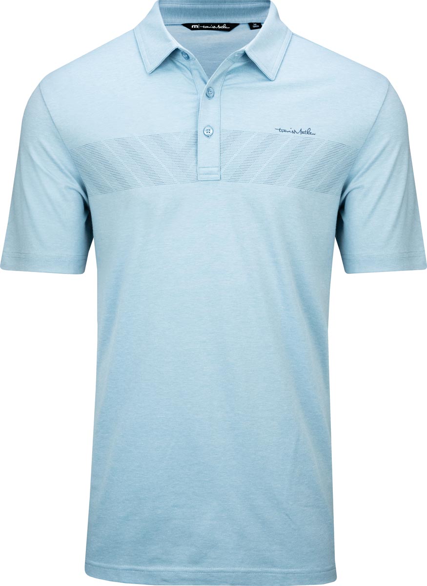 TravisMathew Jungle Pyramid Golf Shirts are constructed with 74% Polyester, 19% Cotton, 7% Elastane, three-button placket, self collar, and a textured chest stripe.