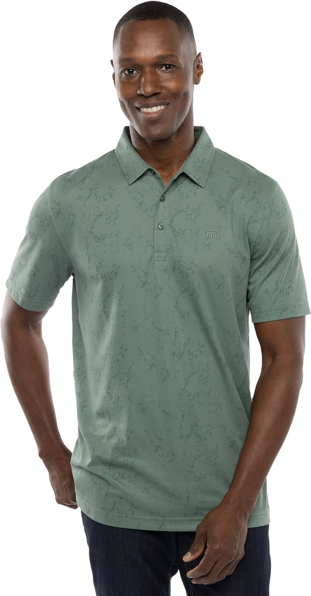 TravisMathew Warmer Tides Golf Shirts are constructed with 58% Cotton, 42% Polyester, three-button placket, self-collar, and a subtle marble print for added style.