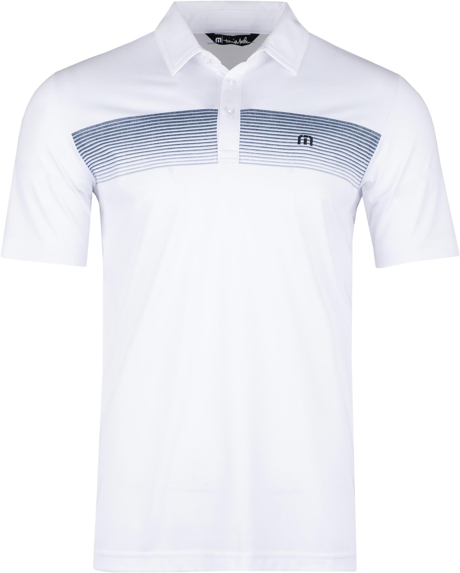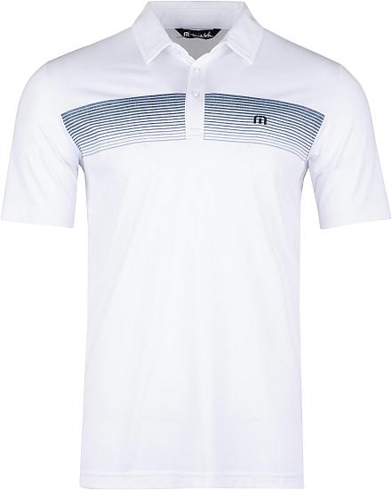 TravisMathew Yacht Flair Golf Shirts are constructed with 59% Cotton, 41% Polyester, three-button placket, self collar, and a trendy ombre chest stripe.